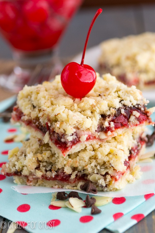 7. Pour the cherry filling over the baked crust and sprinkle on the remaining crumble.